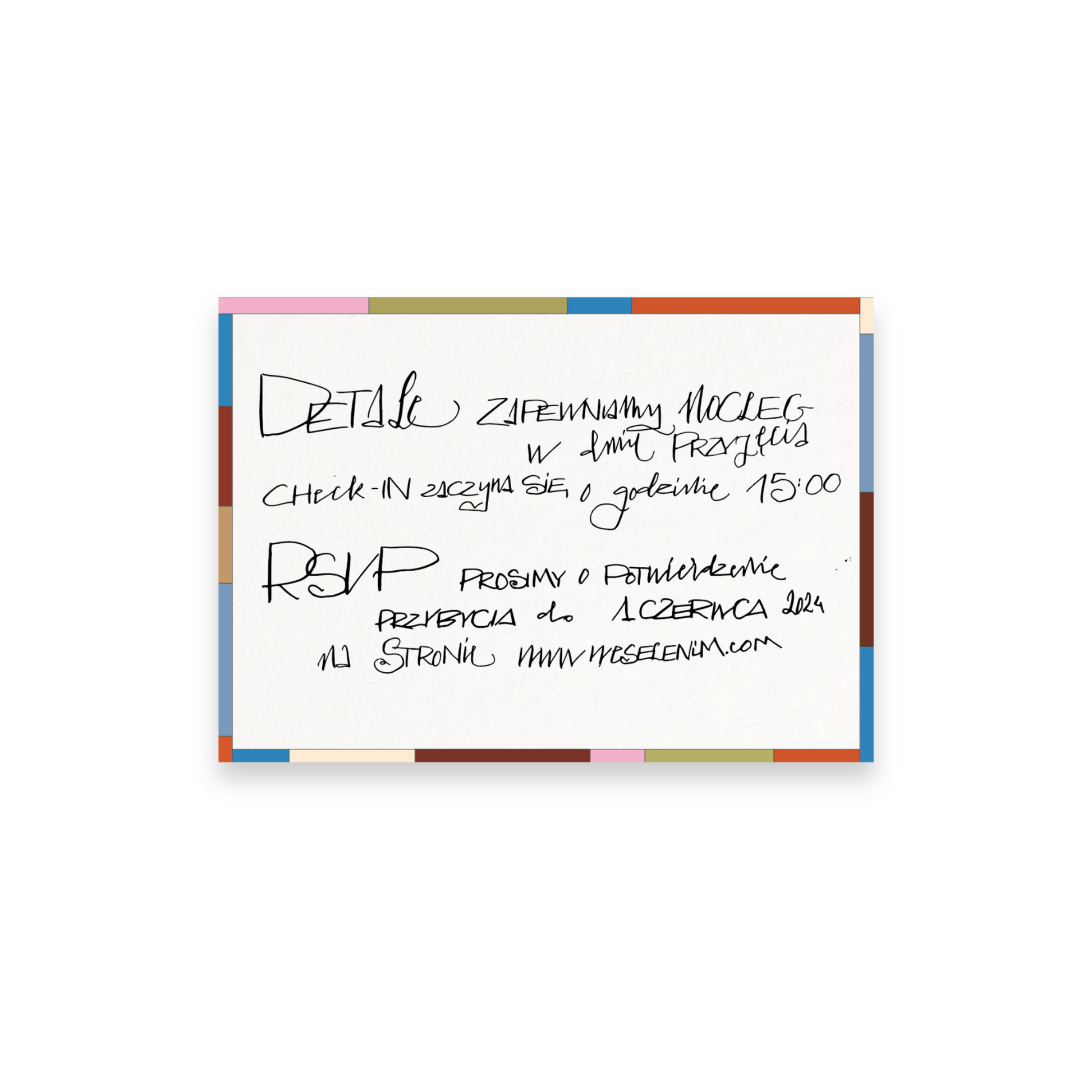 Karta dodatkowa to element zaproszenia, który może pełnić różne funkcje (RSVP, informacje o transporcie, noclegu czy poprawinach). Jest to format mniejszy od karty zaproszenia.