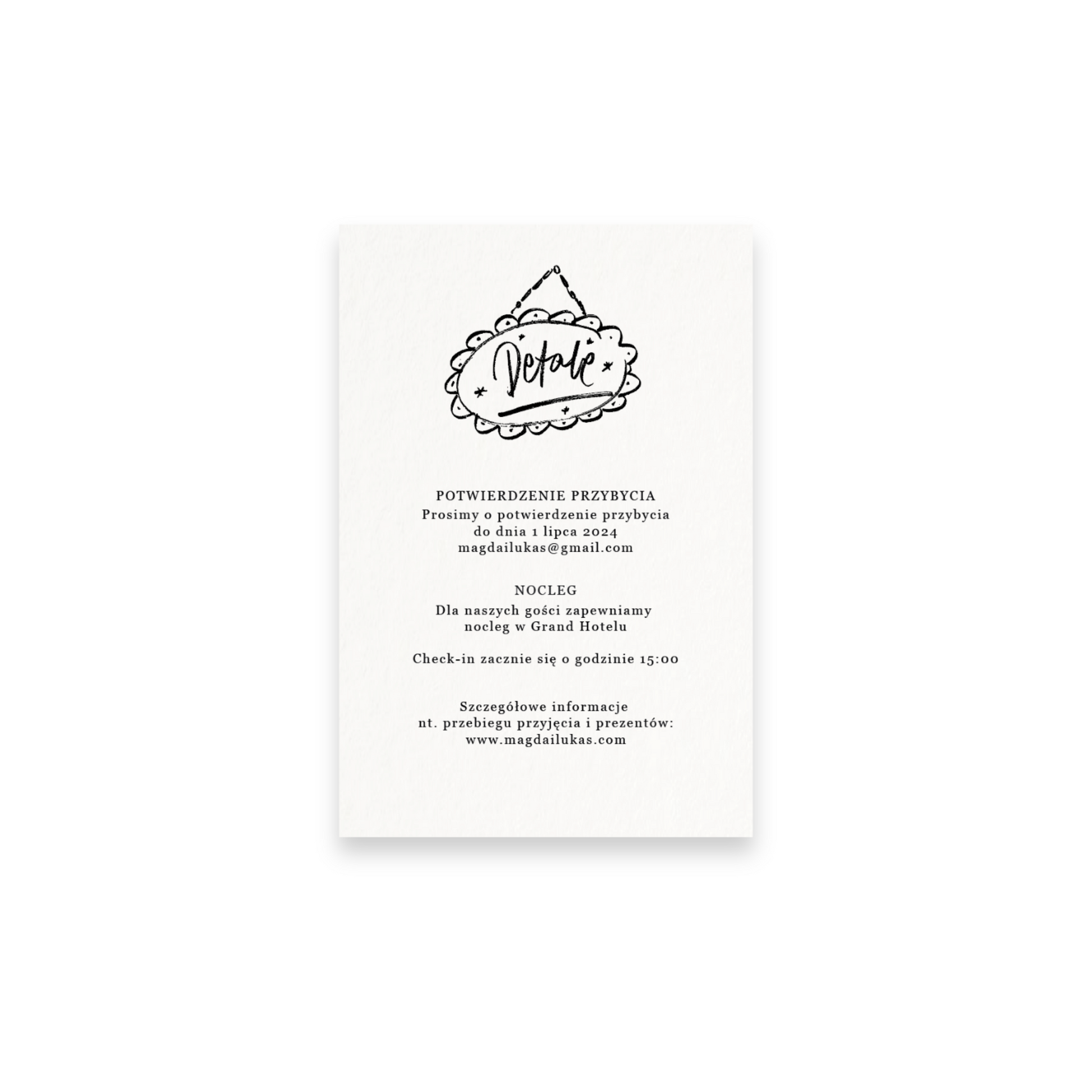 Karta dodatkowa to element zaproszenia, który może pełnić różne funkcje (RSVP, informacje o transporcie, noclegu czy poprawinach). Jest to format mniejszy od karty zaproszenia.