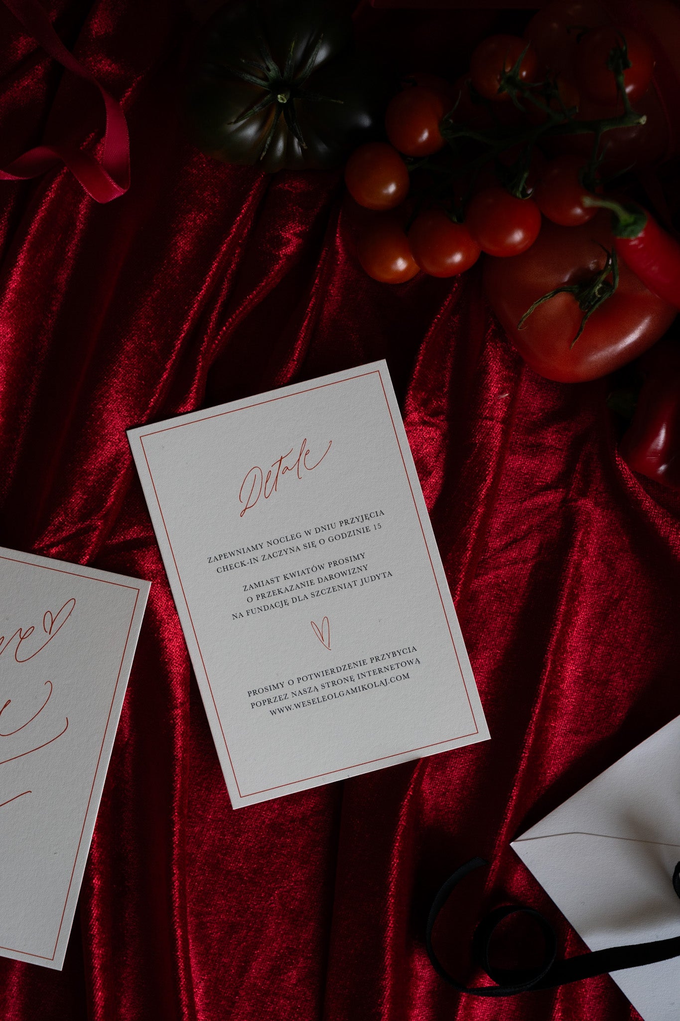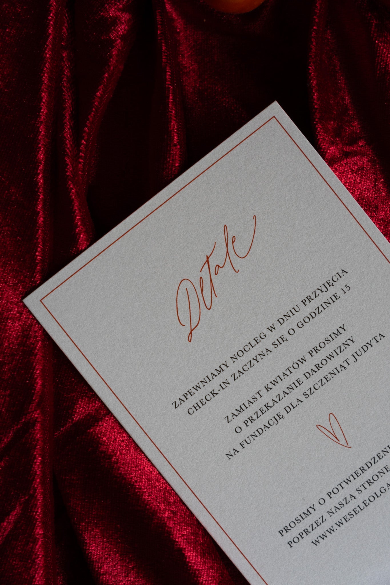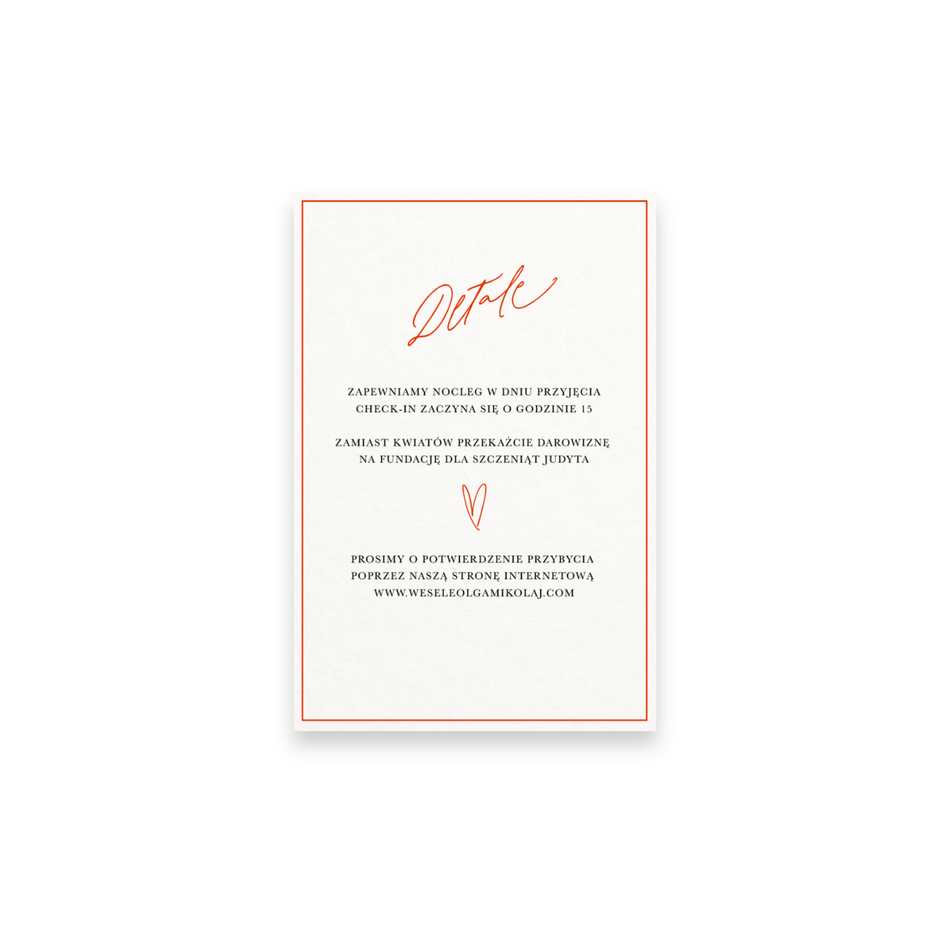 Karta dodatkowa to element zaproszenia, który może pełnić różne funkcje (RSVP, informacje o transporcie, noclegu czy poprawinach). Jest to format mniejszy od karty zaproszenia.
