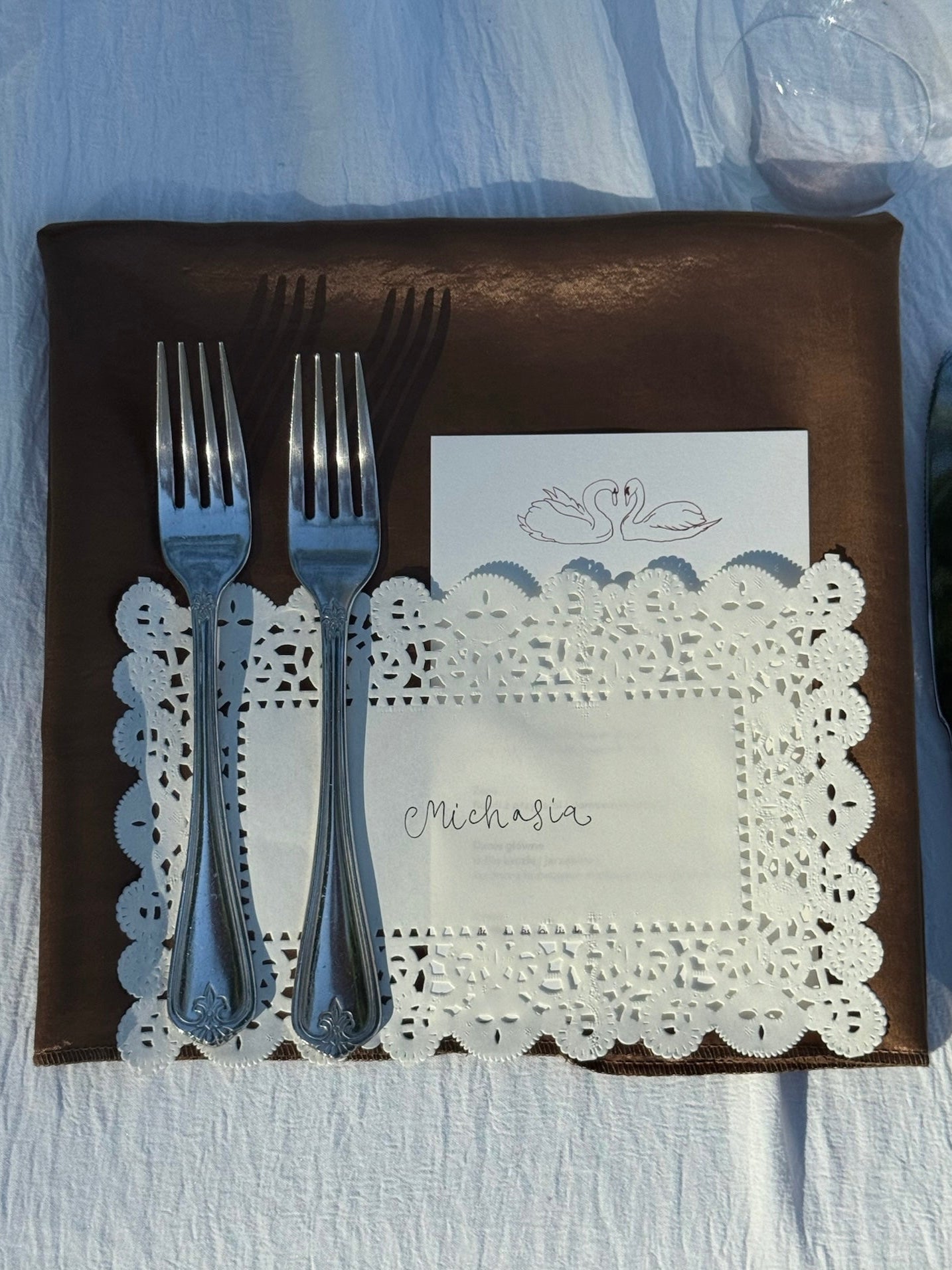 Winietka wypisywana ręcznie na papierowej serwecie.