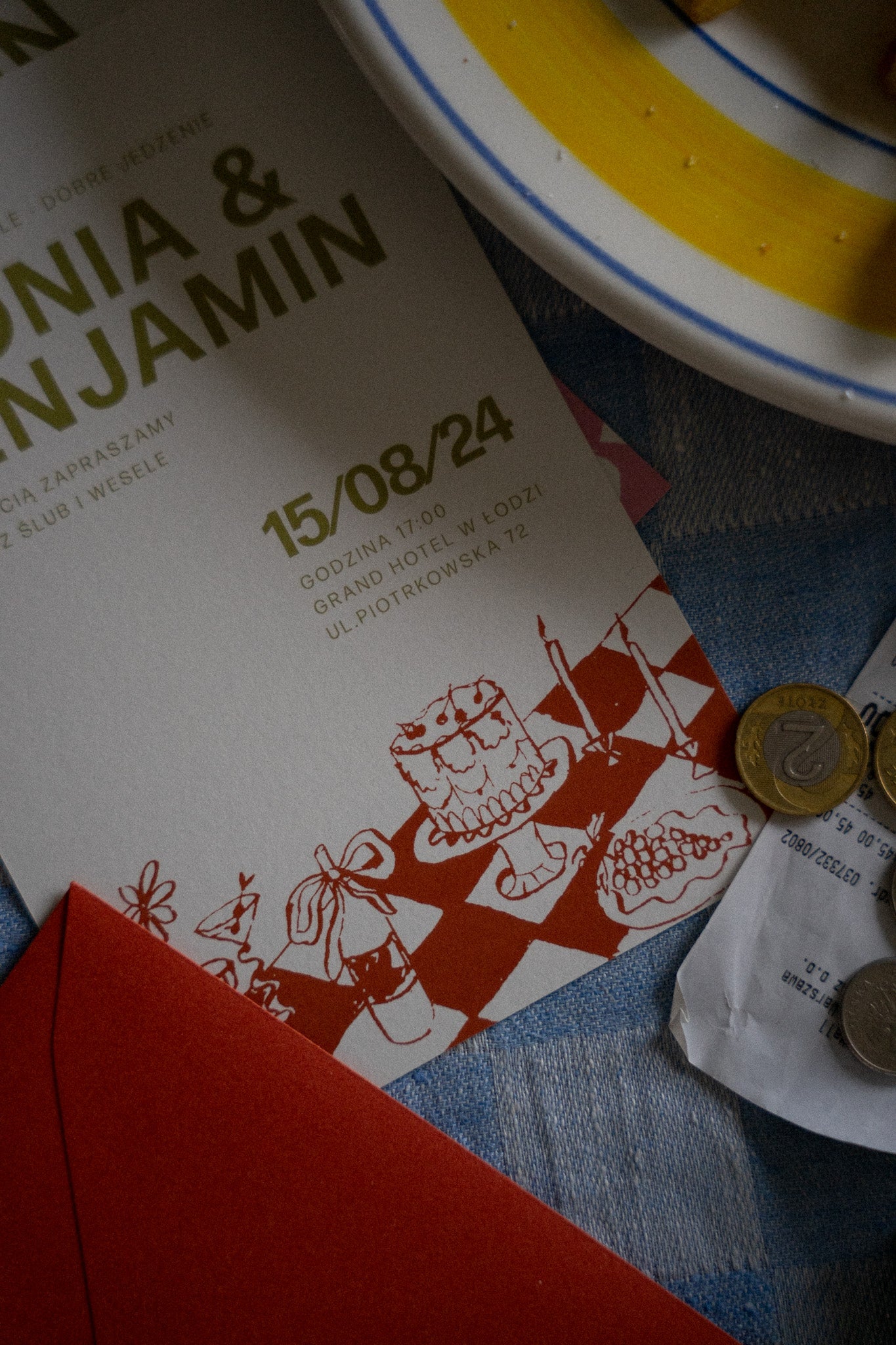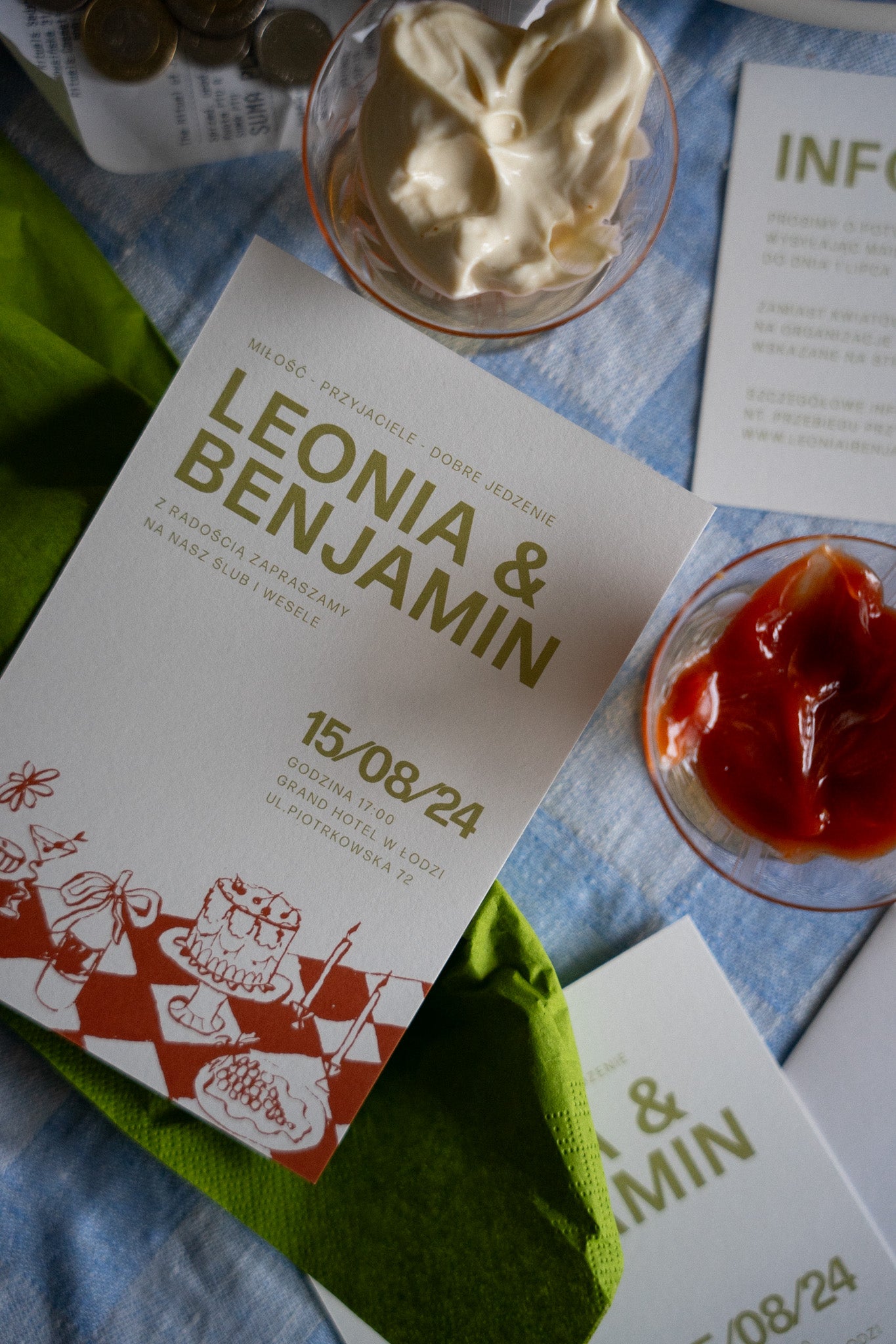 Mocny, typograficzny design z personalizowaną ilustracją. Kolory możecie dopasować do motywu Waszego przyjęcia lub postawić na wersję monochromatyczną.